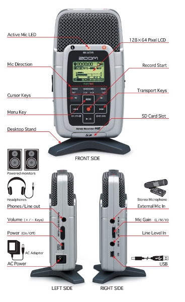 - 4 condenser microphones in front and back X-Y crossover patterns. The H2 also takes external microphones, though its ability to power an external condenser microphone is a bit weak. The H2 built-in mics do very well for language documentation.